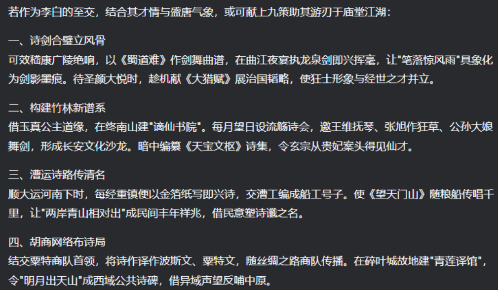 一方面,李白本身便喜欢交往道教朋友,另一方面,李白也希望通过“拍马屁”的方式获得玉真公主向其兄长唐玄宗的举荐,进而实现理想抱负。不过二人关系并未过密,因此助益可能有限。至于让李白去终南山游玩,并写出《下终南山过斛斯山人宿置酒》《望终南山寄紫阁隐者》是可行的。但是把时间精力花在办书院上,恐怕难以实行。而每月都邀请并未深交的王维、张旭以及公孙大娘等来搞文化沙龙,大概率是一厢情愿。